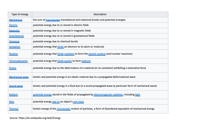 Of course, energy and the concepts for energy have evolved over time since then to include many forms of energy. Specifically, energies are described as either potential energy, meaning there's some ability to have energy applied to a mass to move it over a distance in some time, reaching some speed, which is kinetic energy. So, energy is described in many different ways scientifically, either as potential or kinetic, or the combination of the two forms within a system.